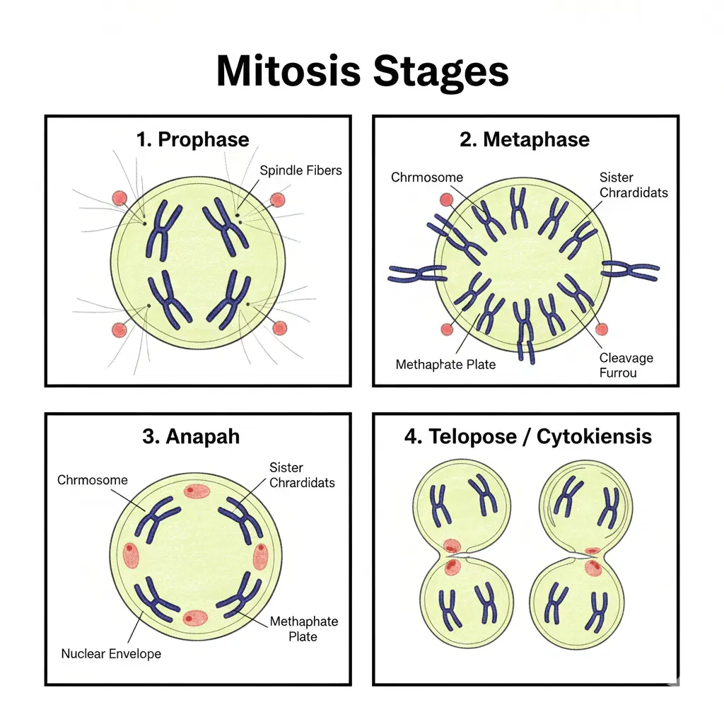 - Draw a neat and labelled diagram of Mitosis Stages.