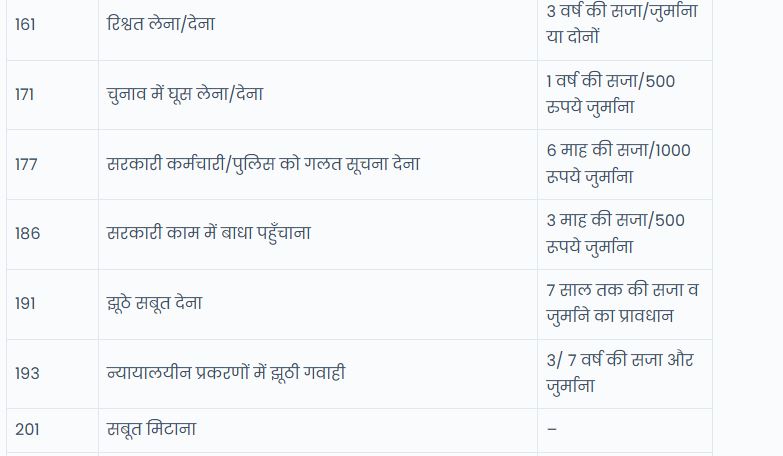 | 177 | सरकारी कर्मचारी/पुलिस को गलत सूचना देना | 6 माह की सजा/1000 रूपये जुर्माना |