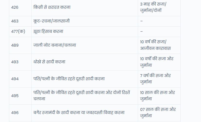 | 495 | पति/पत्नी के जीवित रहते दूसरी शादी करना और दोनों रिश्तें चलाना | 10 साल की सजा और जुर्माना |