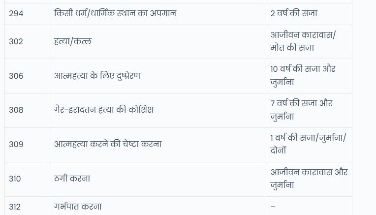 | 302 | हत्या/कत्ल | आजीवन कारावास/मौत की सजा |