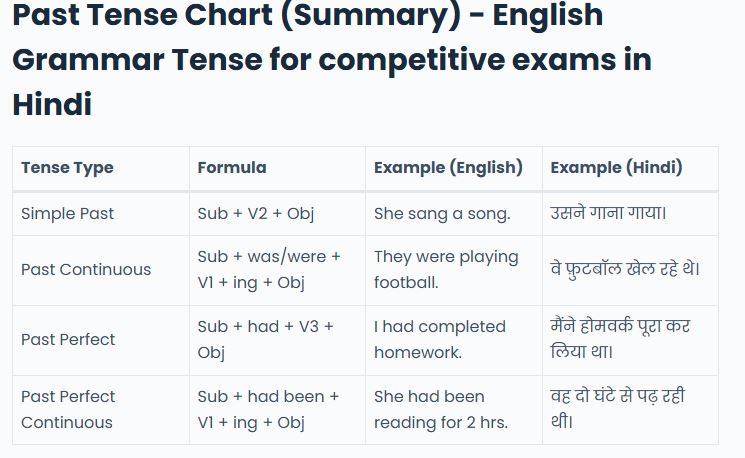 Past Tense Chart (Summary) – English Grammar Tense for competitive exams in Hindi